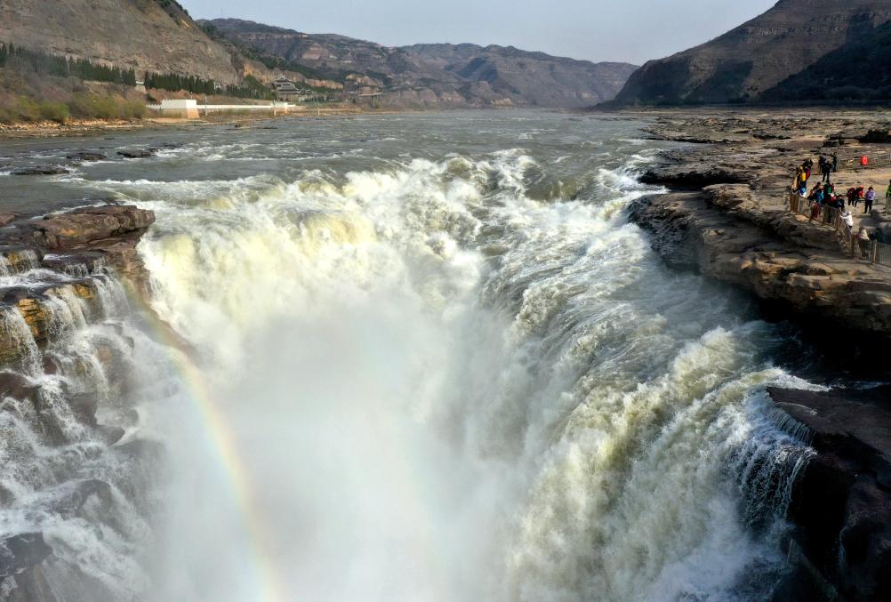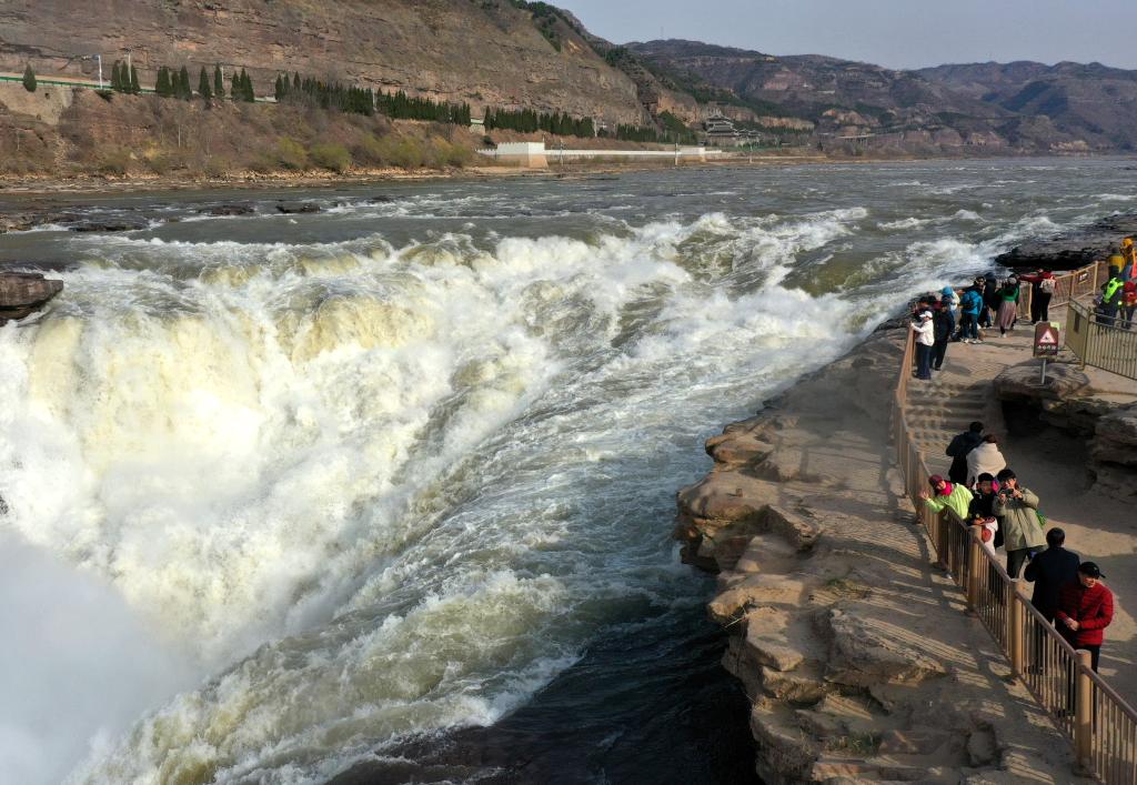 游客在黄河壶口瀑布欣赏“清流飞瀑”美景。(吕桂明 摄)