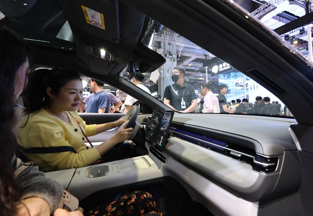 2025年4月26日,正在国家会展中心(上海)举行的第二十一届上海国际汽车工业展览会上,中国品牌汽车制造商除展示最新技术外,纷纷推出新款车型,受到中外参观者广泛关注。这是参观者在小鹏G6展车内体验车载智能系统。新华社记者 方喆 摄