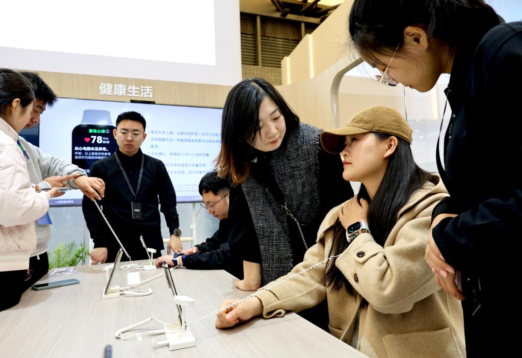2025年3月20日,一位参观者(右二)在体验智能手表的腕部动态血压记录仪功能。当日,以“AI科技、AI生活”为主题的2025中国家电及消费电子博览会(AWE2025)在上海新国际博览中心开幕。本届展会吸引全球千余家企业参展,全景展示家电及消费电子领域的前沿成果,呈现AI赋能智慧生活的新产品、新方案、新场景。新华社记者 方喆 摄