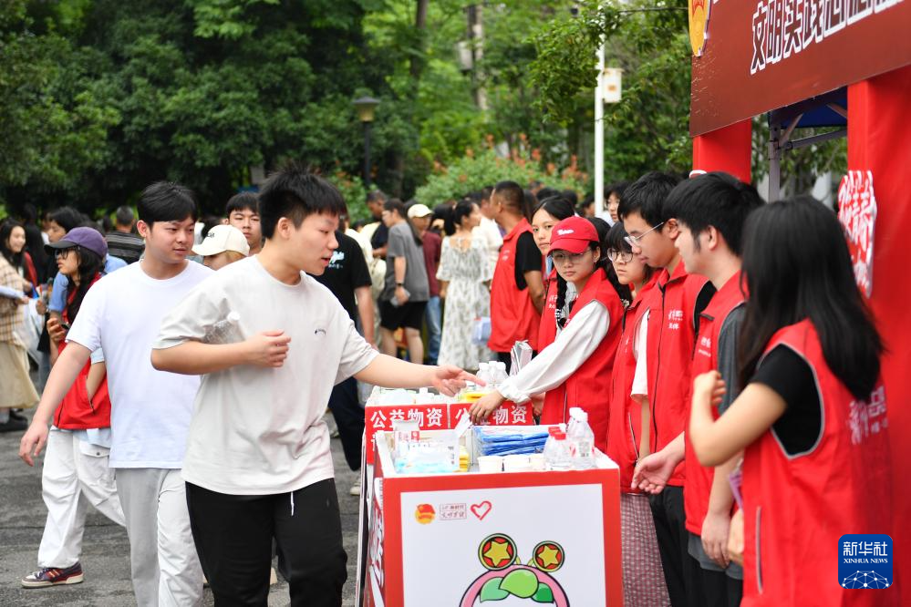 6月8日,志愿者在湖南省天心考区长郡湘府中学考点为考生提供饮用水。新华社记者 陈振海 摄