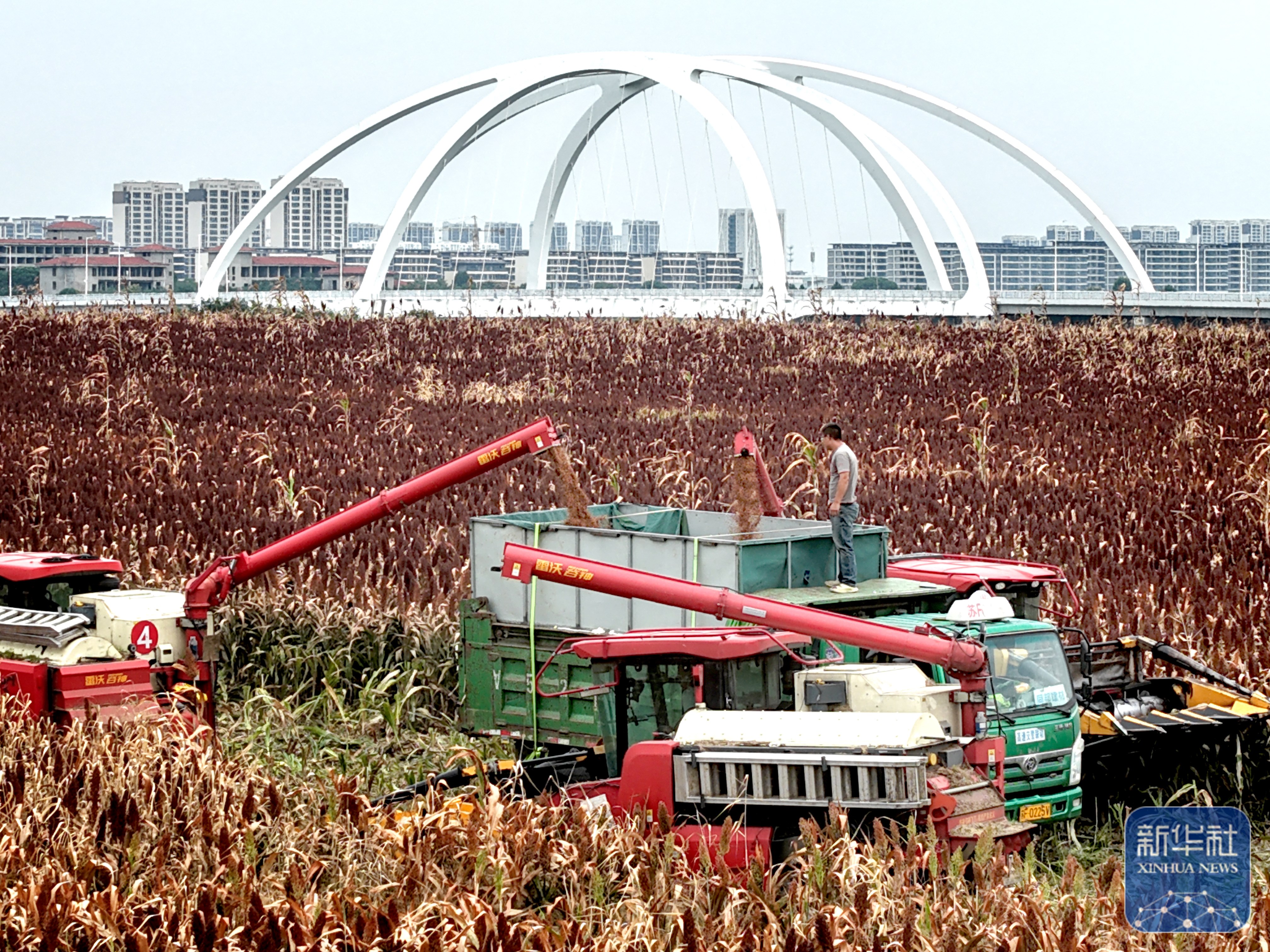 ↑ 9月21日,收割机卸下收割的高粱(无人机照片)。新华社发(许丛军摄)