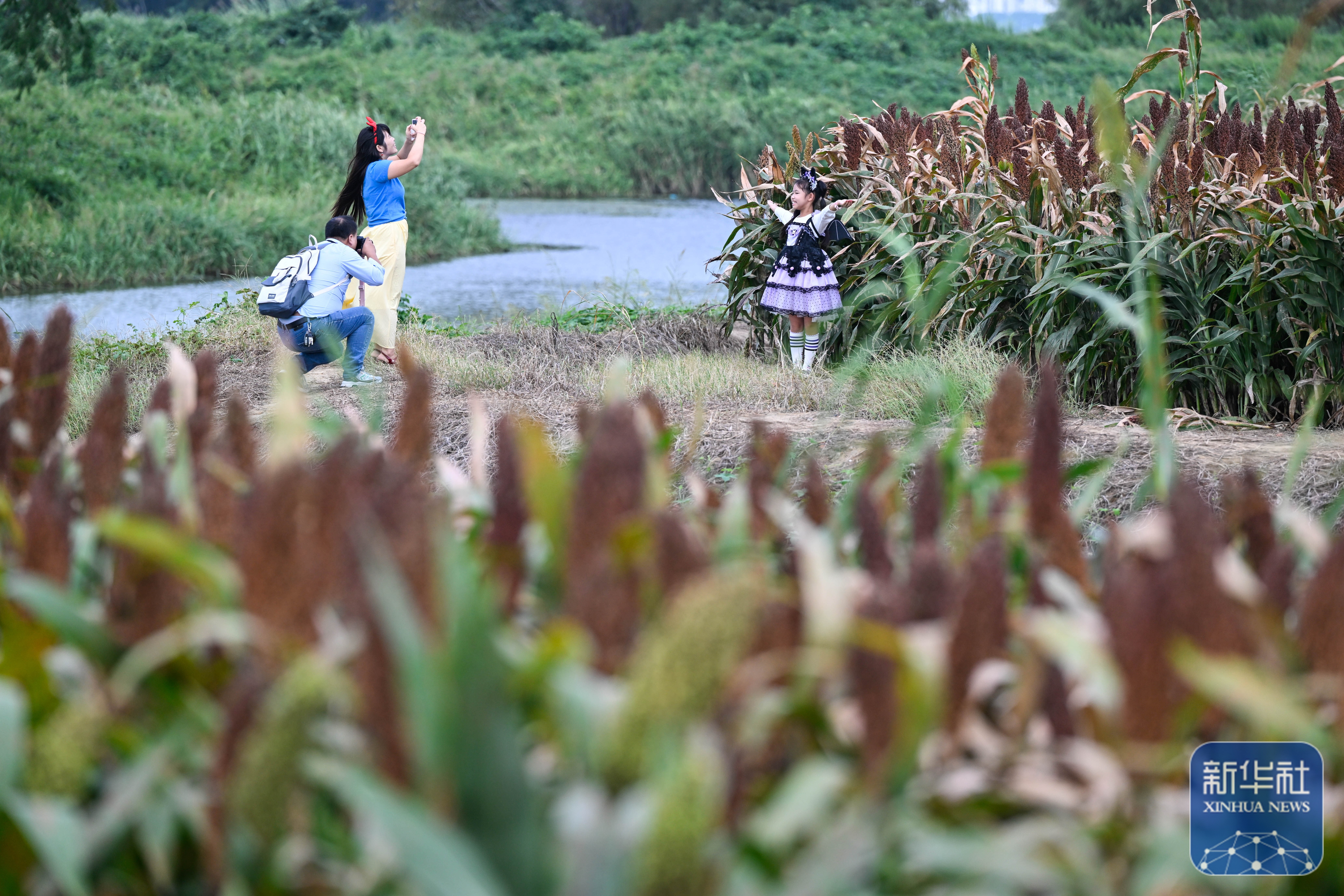 ↑ 9月21日,游人在高粱地打卡拍照。新华社记者 季春鹏 摄