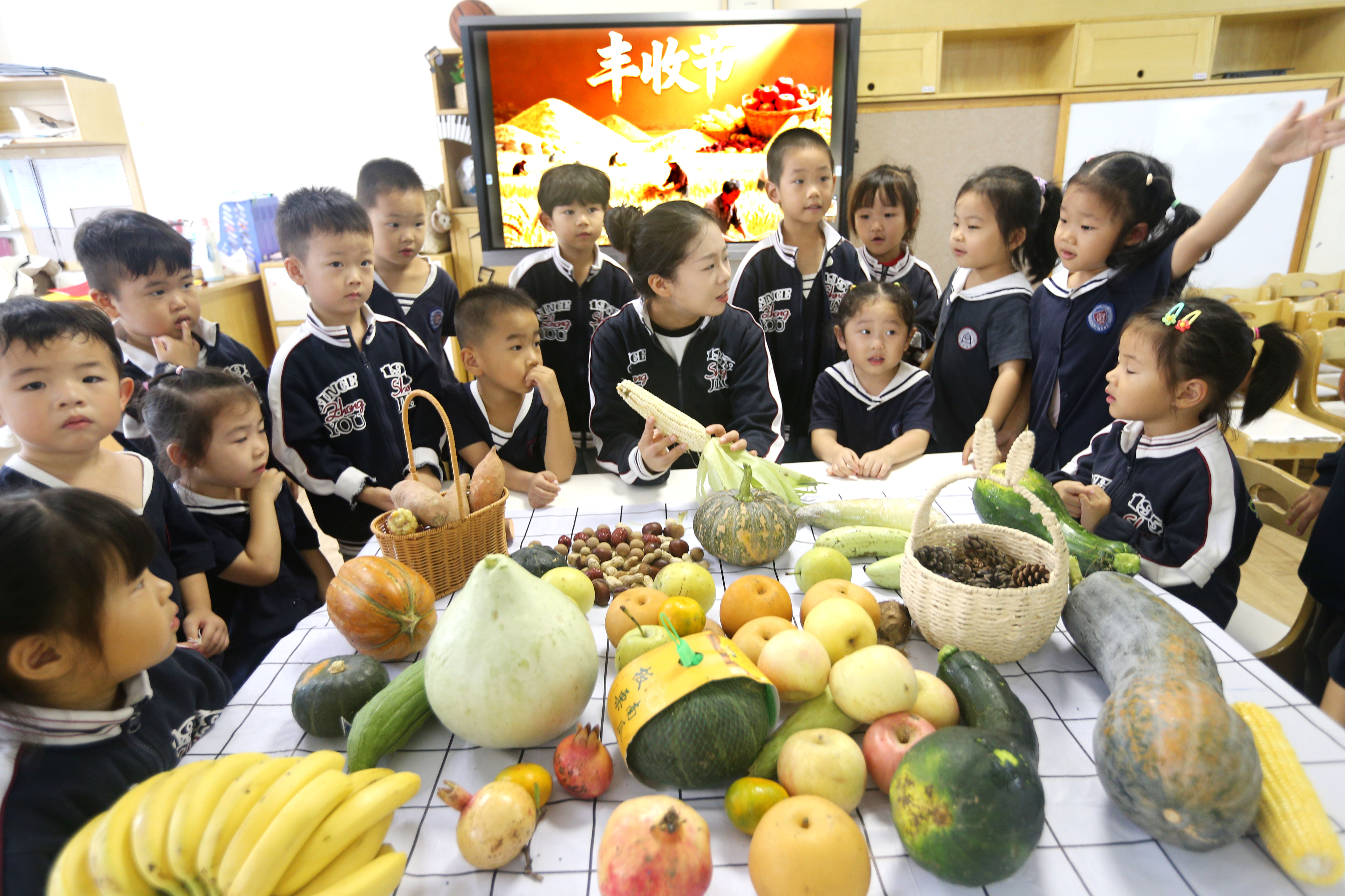 ↑9月23日,在江苏省连云港市钟声幸福幼儿园,老师在“萌娃欢乐迎丰收”活动中给小朋友讲解粮食知识。新华社发(王春摄)