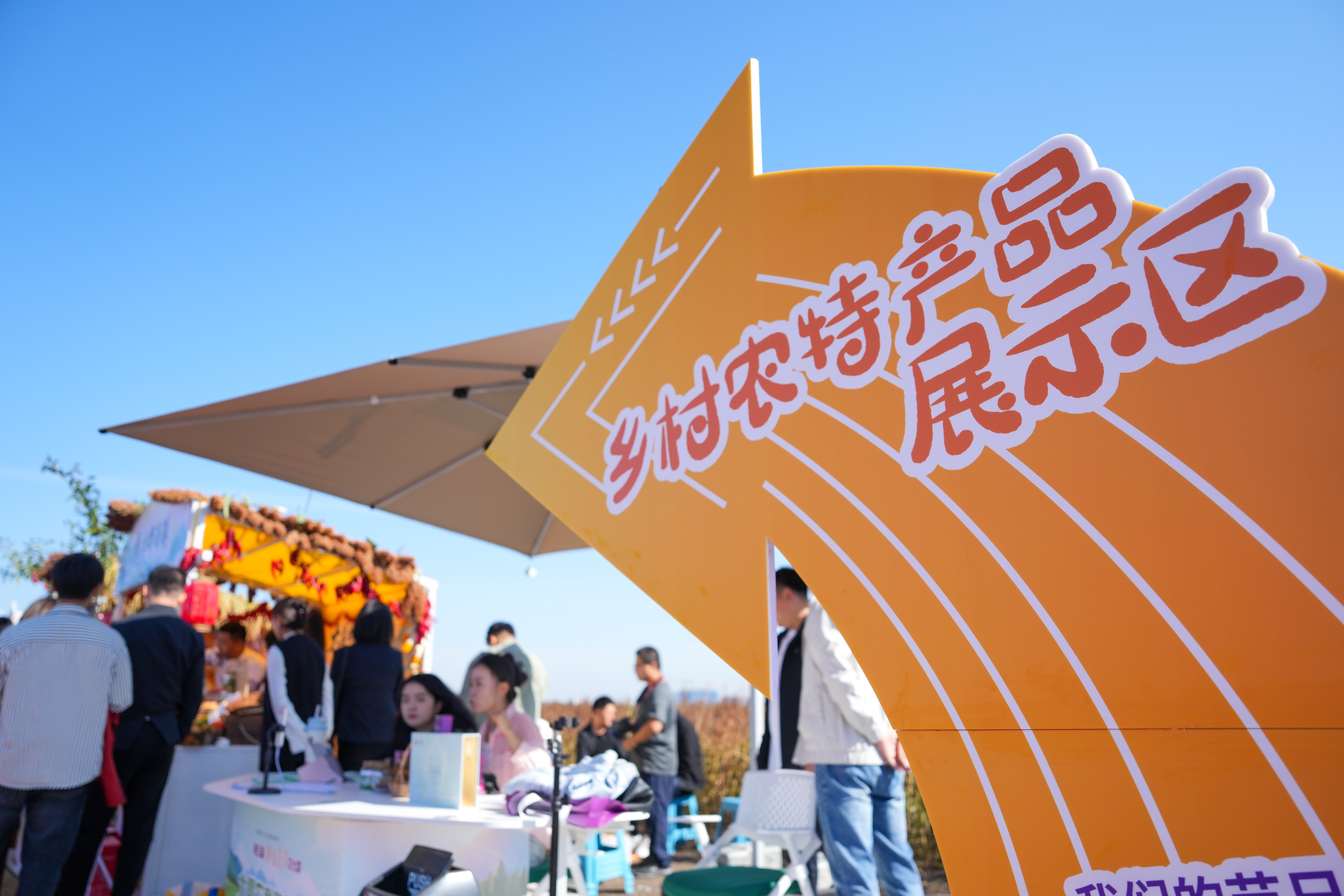 ↑9月23日,黑龙江省佳木斯市桦南县举办庆祝中国农民丰收节活动,参观者在乡村农特产品展示区参观。新华社记者 王建威 摄