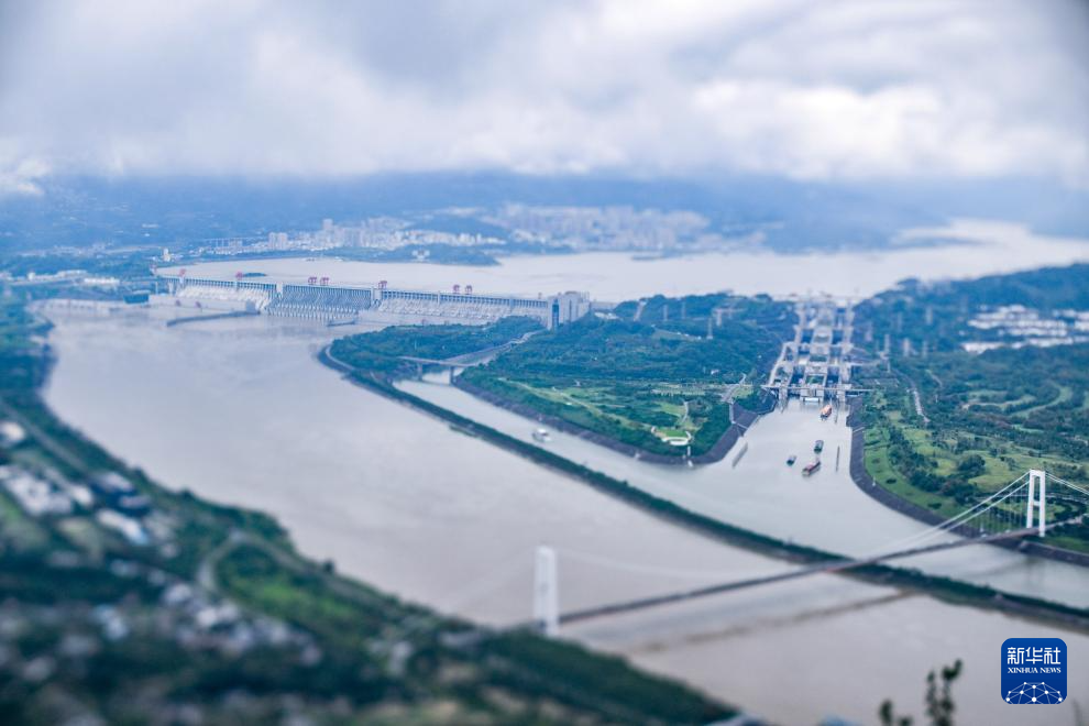 10月4日拍摄的三峡大坝和三峡大坝五级船闸(移轴镜头拍摄)。新华社记者 陈晔华 摄