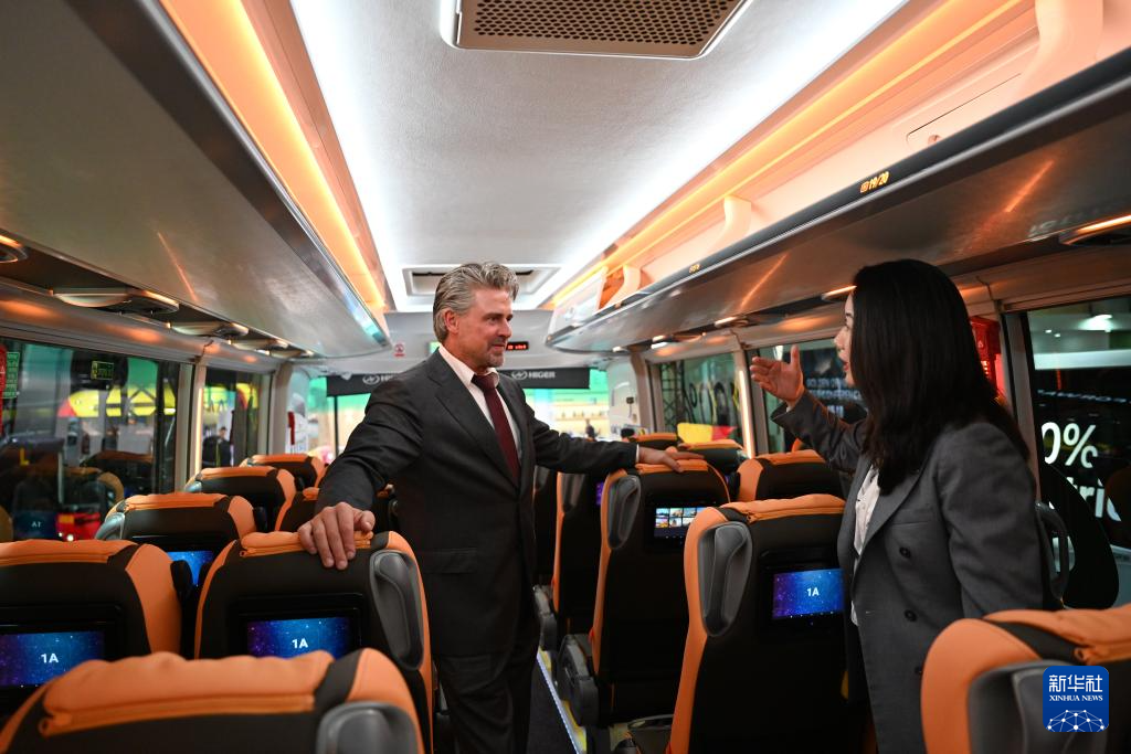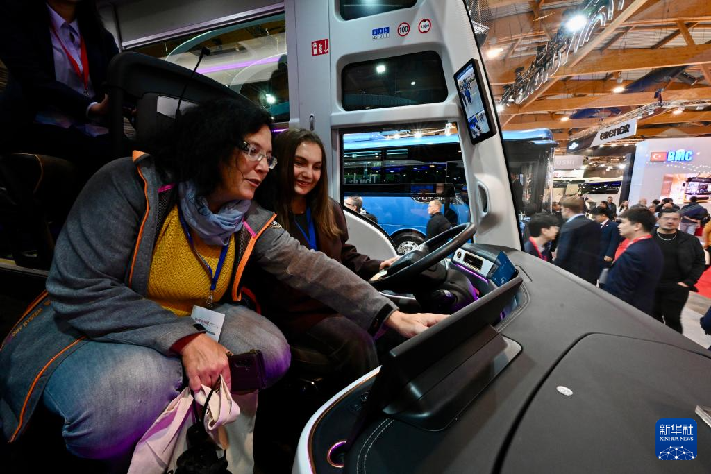 10月4日,在比利时布鲁塞尔举行的世界客车博览会上,工作人员在展出的海格品牌欧洲首发的纯电新V系客车内部向客户做介绍。新华社记者 吕优 摄