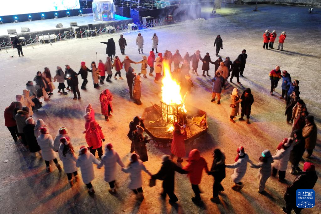 12月21日,游人在北极村活动现场参加篝火晚会(无人机照片)。新华社发(邵天李摄)