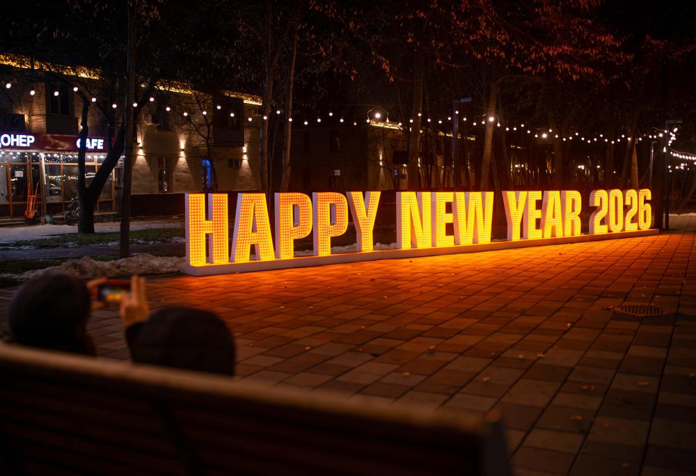 2025年12月30日,在哈萨克斯坦阿拉木图街头,一名男子在一处新年灯光装置前拍照。