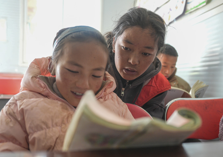 西藏大学学生措姆在西藏定日县曲洛乡热木青村地震安置点为学生辅导作业(2025年1月25日摄)。新华社记者 晋美多吉 摄