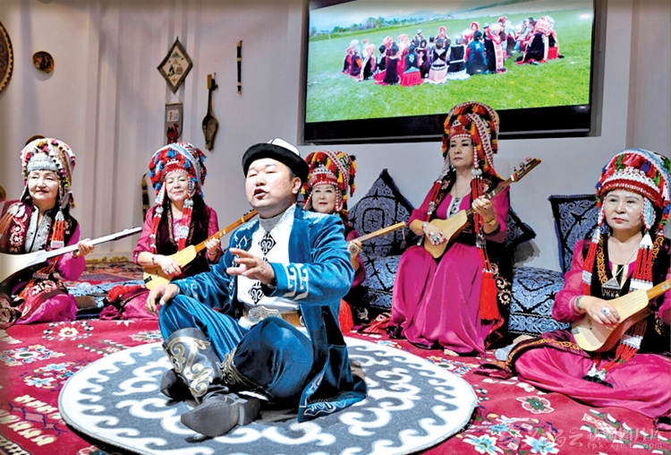 2025年9月12日,在庆祝新疆维吾尔自治区成立70周年——克孜勒苏柯尔克孜自治州主题成就展展厅内,阿图什市民间艺人深情吟唱英雄史诗《玛纳斯》。本报资料图