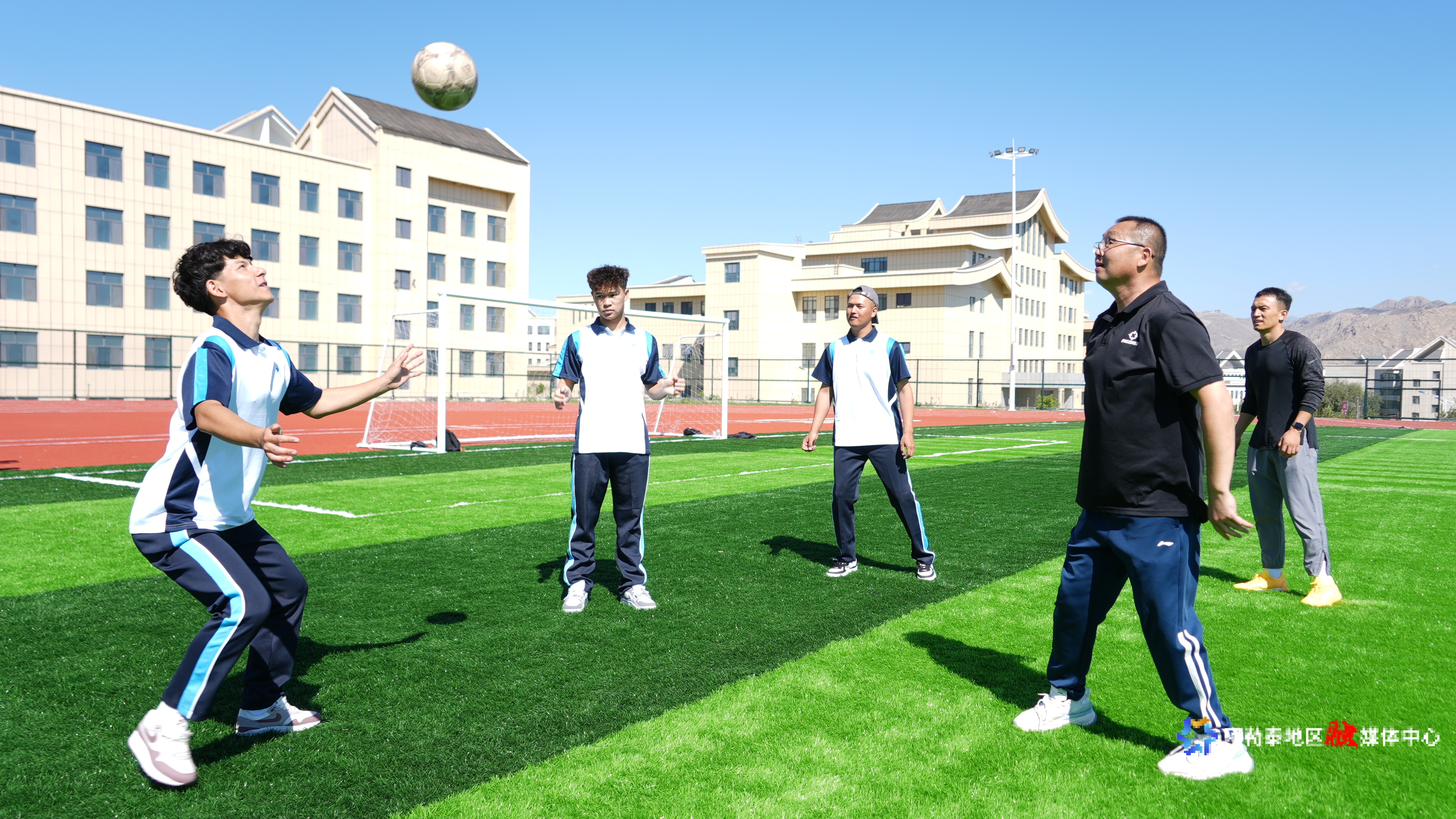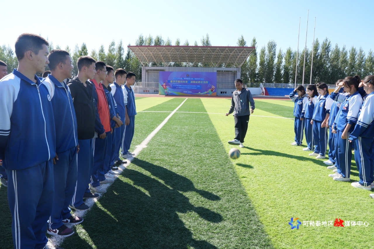 吉木乃县高级中学体育老师 高世忠正在给教学生讲解踢球动作要领。