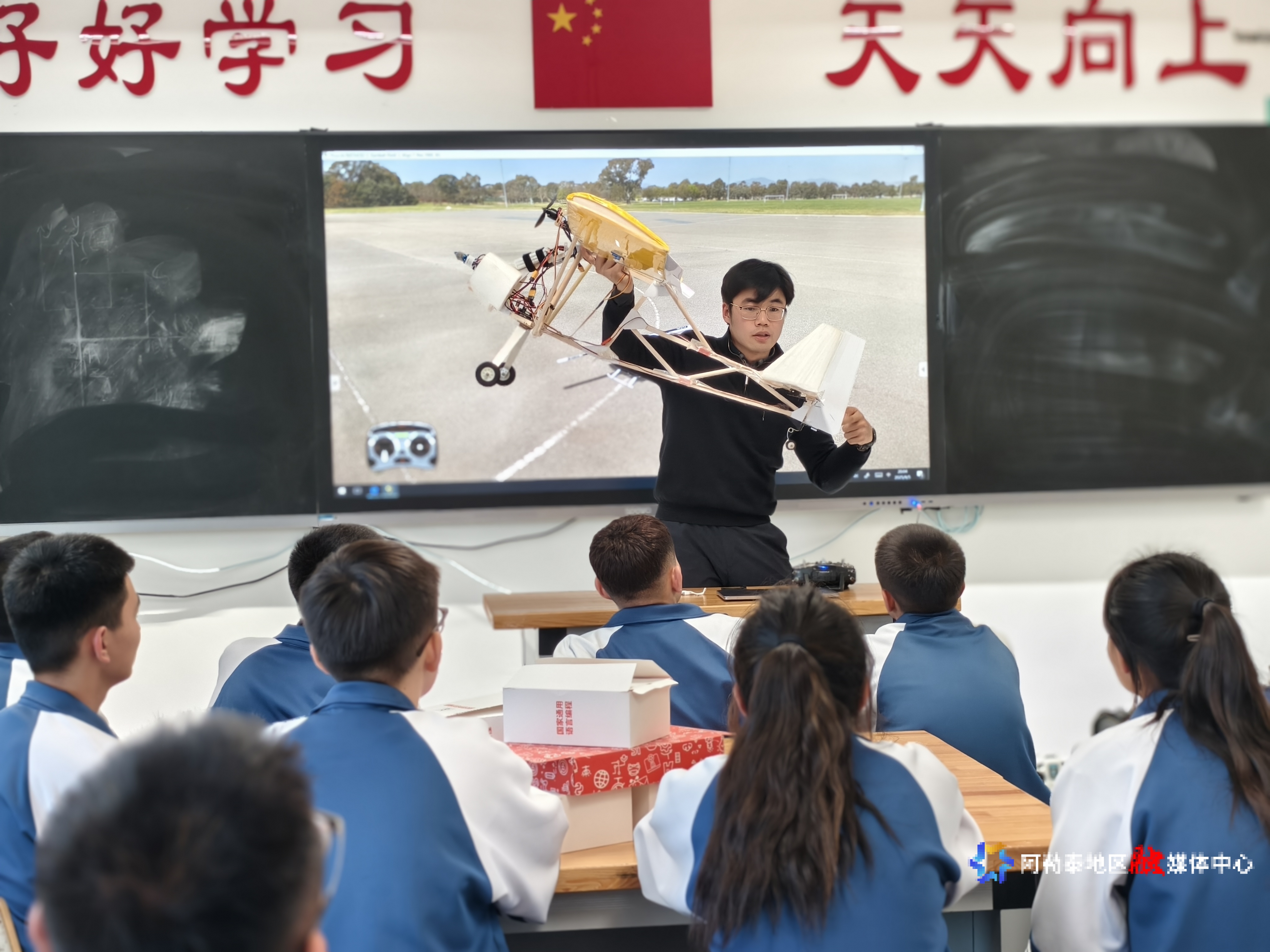 北京航空航天大学研究生支教团成员王贞元在位航模社团向吉木乃学生授课。