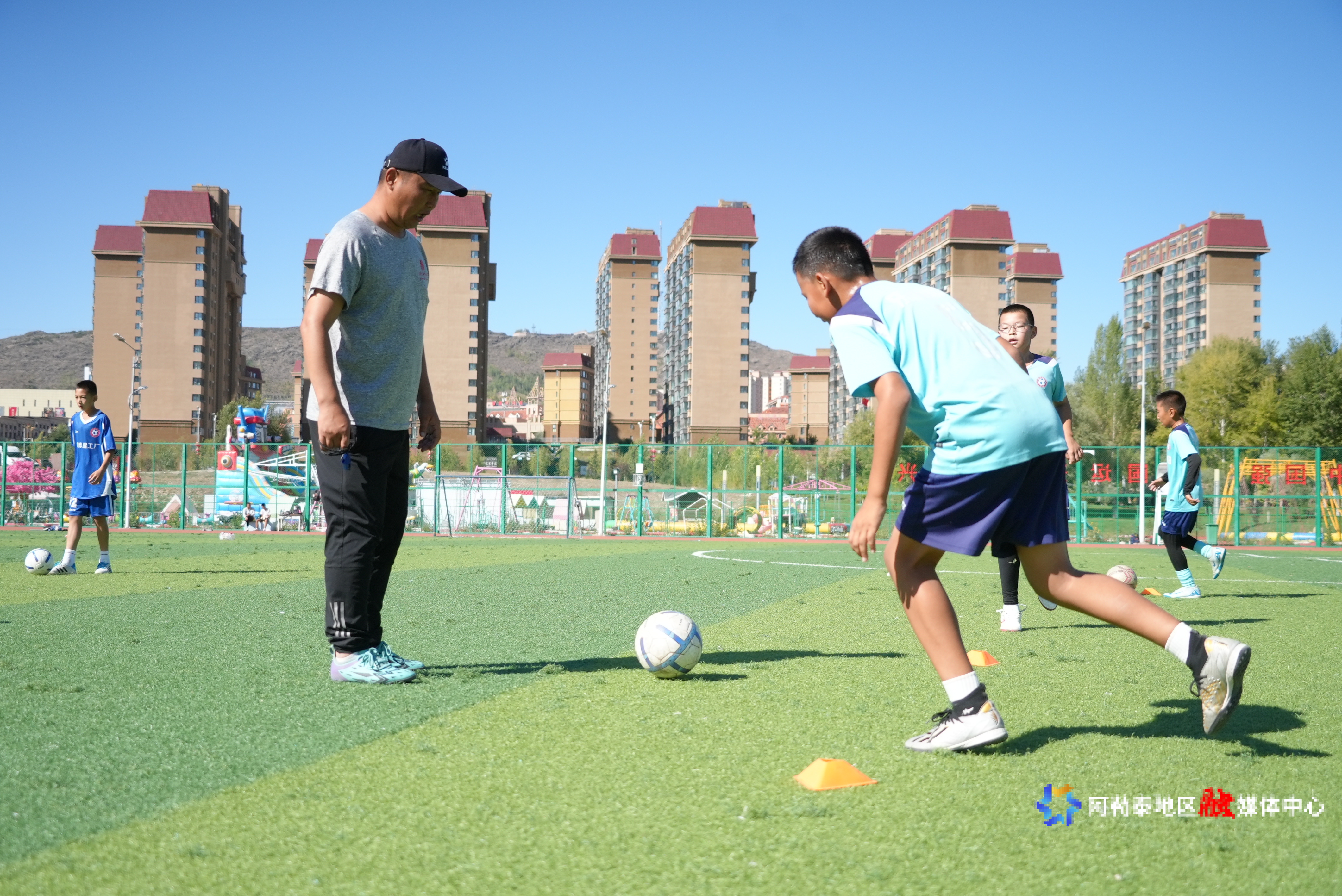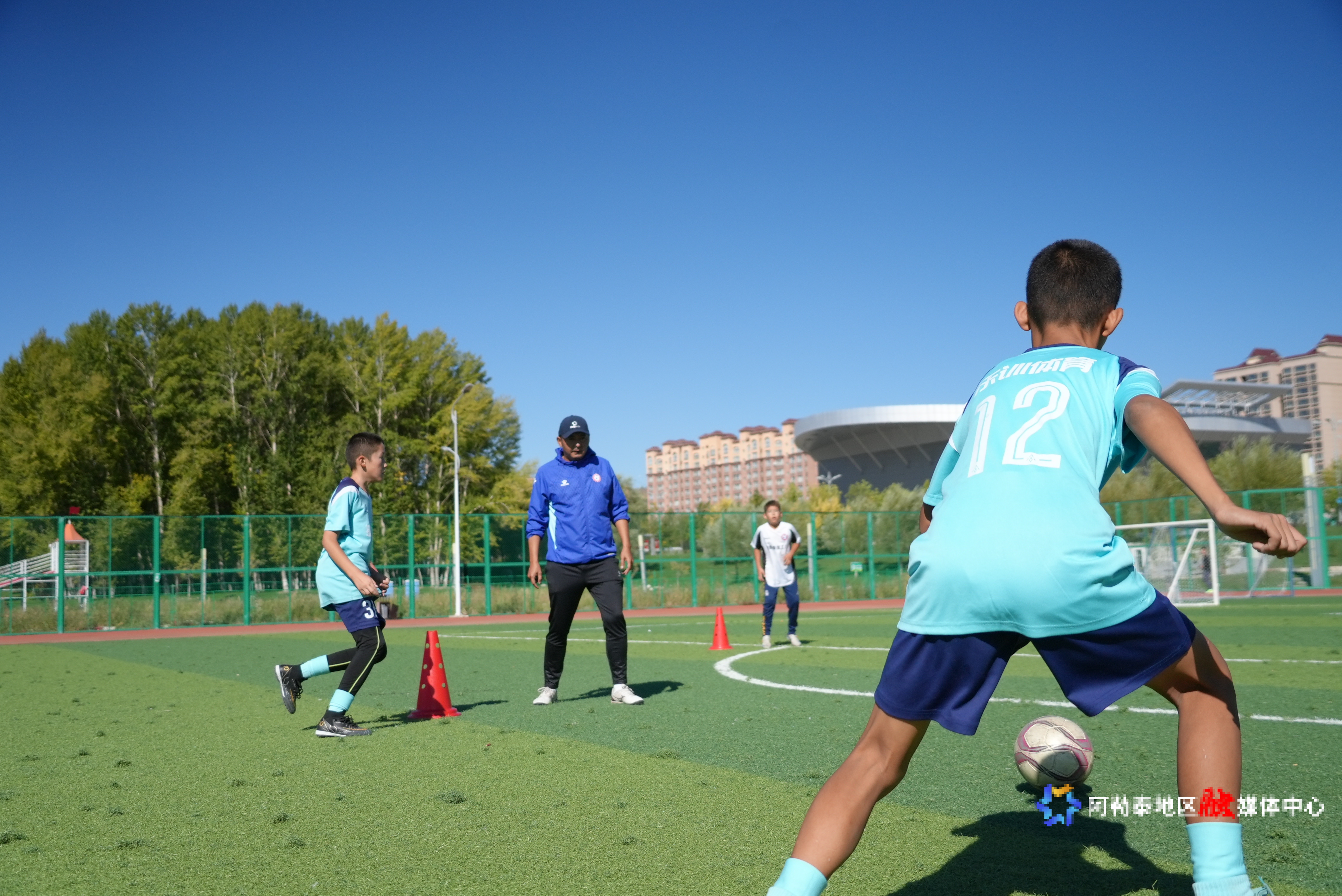 在阿勒泰市全季体育公园的绿茵场上,阿勒泰星工厂足球俱乐部教练员沙勒塔那提·达吾列提带领少年球员开展控球训练。