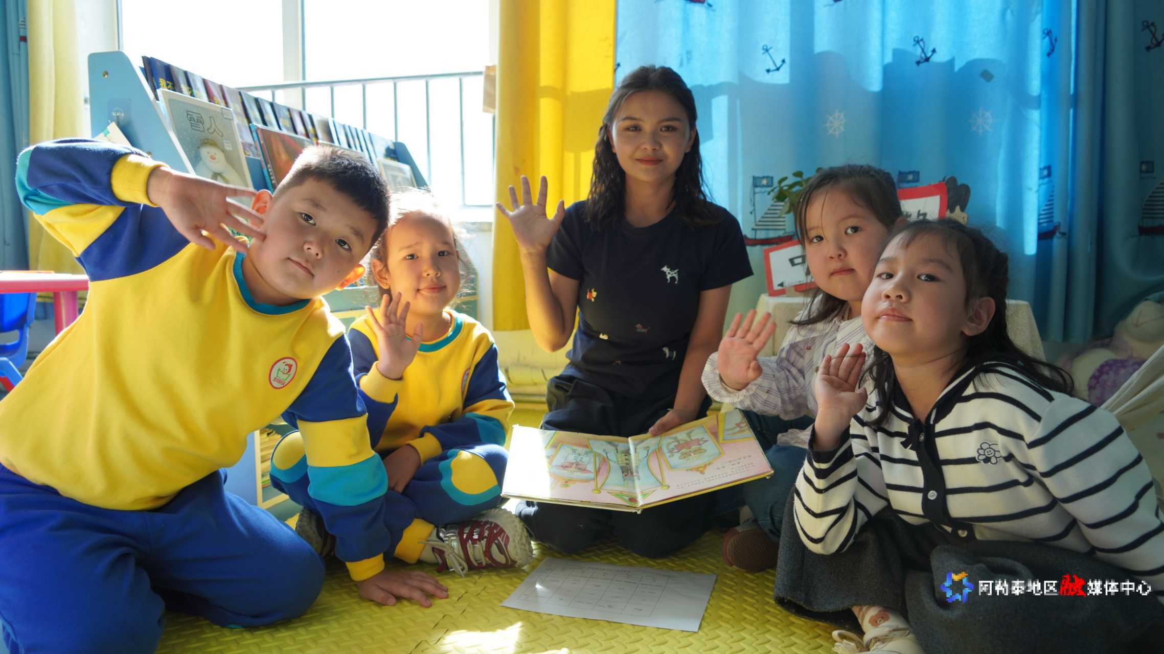 阿勒泰市蓝天幼儿园的老师和孩子们一起做手指操。