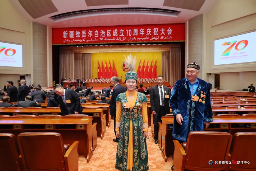 阿勒泰新闻网-阿勒泰地区融媒体中心(记者 古丽娜 胡俊秀 古扎丽·阿布都热西提 马海娜·马格尔 特约记者 阿依多斯·阿根别克 刘金锐 通讯员 阿吴英·哈得勒别克)9月25日上午,新疆维吾尔自治区成立70周年庆祝大会在新疆人民会堂隆重举行。参加庆祝大会的阿勒泰地区各族干部群众代表纷纷表示,要紧密团结在以习近平同志为核心的党中央周围,始终牢记习近平总书记嘱托,铸牢中华民族共同体意识,共同团结奋斗、共同繁荣发展,奋力书写中国式现代化新篇章。