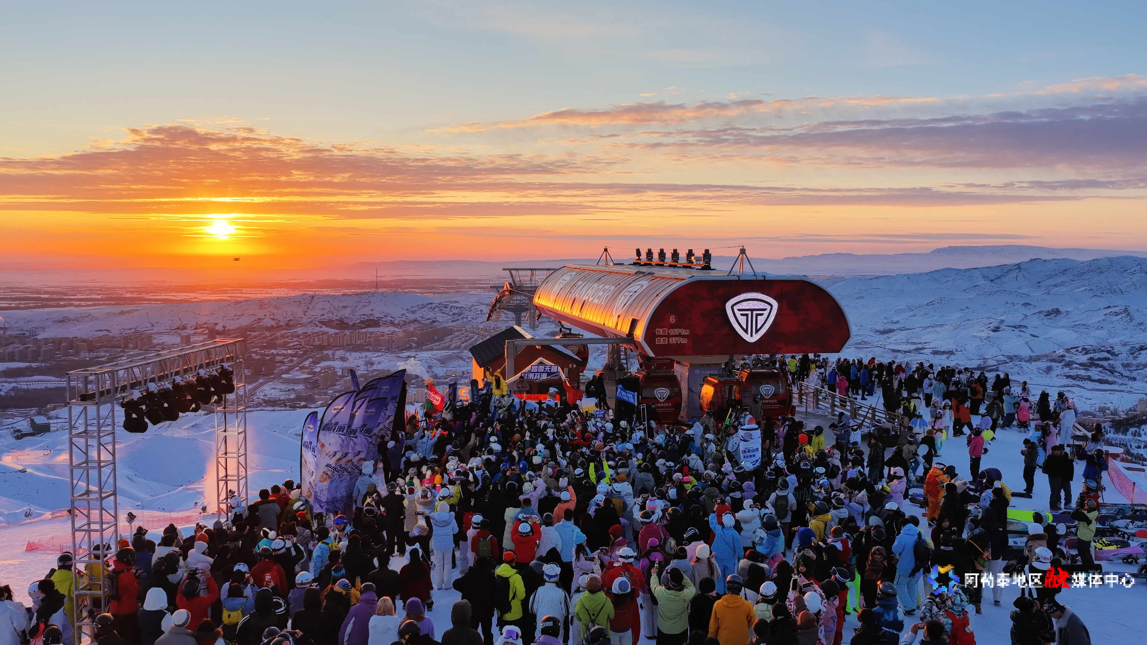 活动现场,将军山山顶人声鼎沸。身着色彩鲜亮滑雪服的雪友们陆续汇聚,有的在观景平台抢占最佳机位,有的随着动感音乐提前热场。夕阳“蓝调时刻”的绝美光影让现场游客纷纷举起手机定格瞬间。