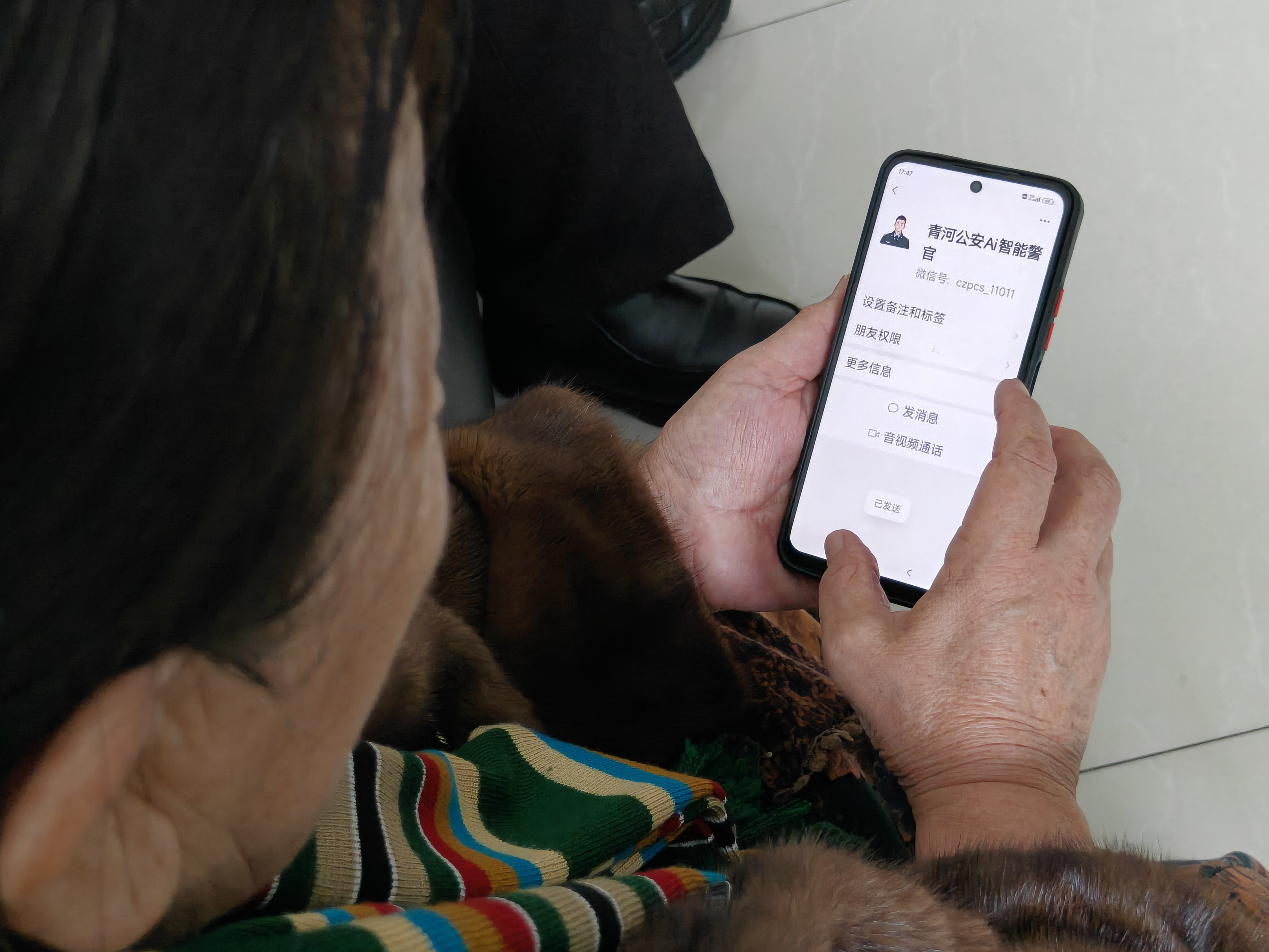 青河镇派出所民警引导年老年群众操作手机,展示“青河公安AI智能警官”的使用界面。该AI警务助手可提供法规查询、隐患上报、纠纷调解等服务,实现24小时在线响应,助力群众便捷解决警务相关问题。