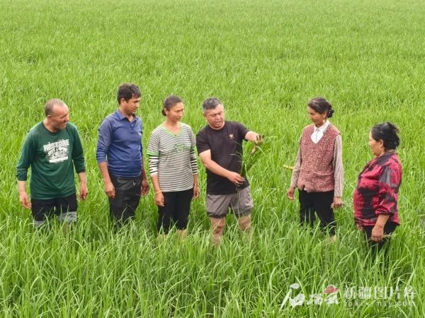 眼下,策勒县恰哈乡250亩“新稻五五”长势茂盛,微风吹拂下掀起层层稻浪,乡村两级干部和技术人员正带领群众开展田间管理作业。