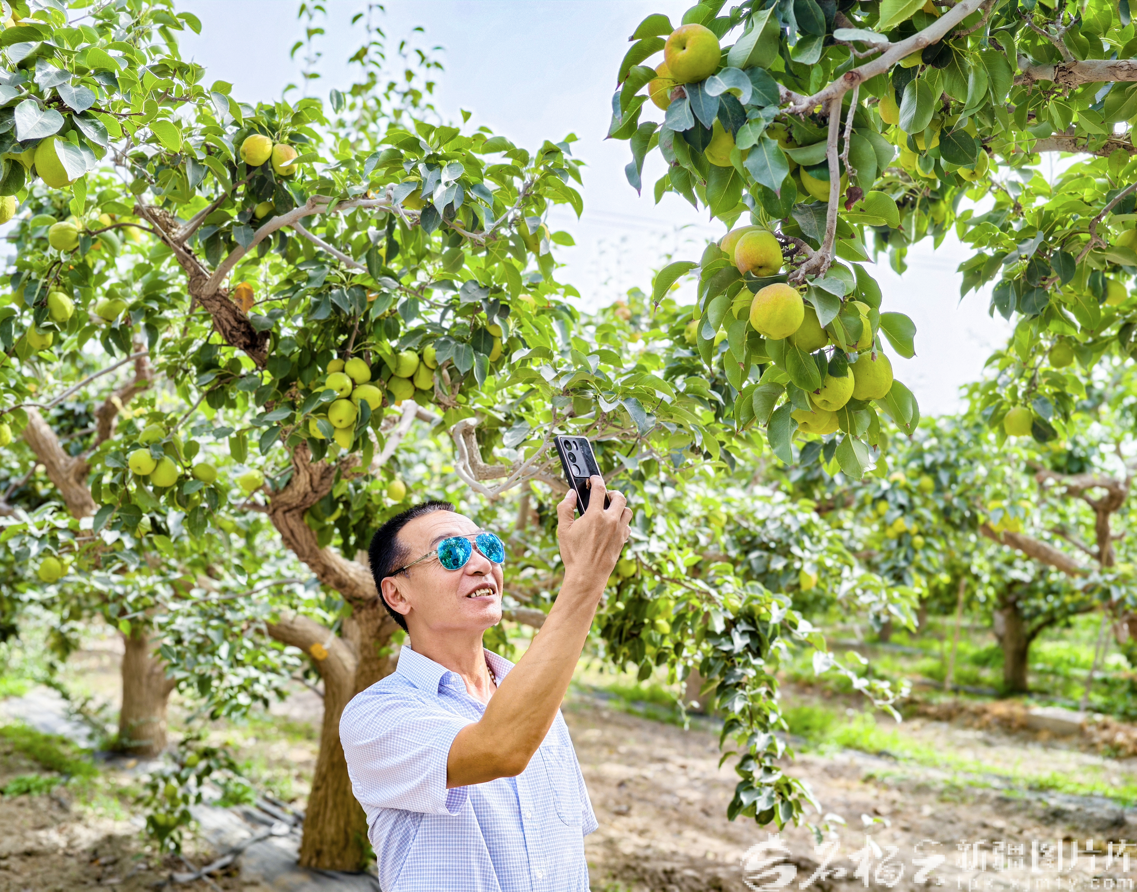 9月8日,游客在阿瓦提乡的梨园拍摄香梨。