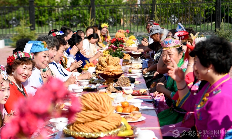 塔城市新城街道哈尔墩社区居民在“邻里节百家宴”上品尝美食(2023年5月17日摄)。天山网-新疆日报记者汤永摄