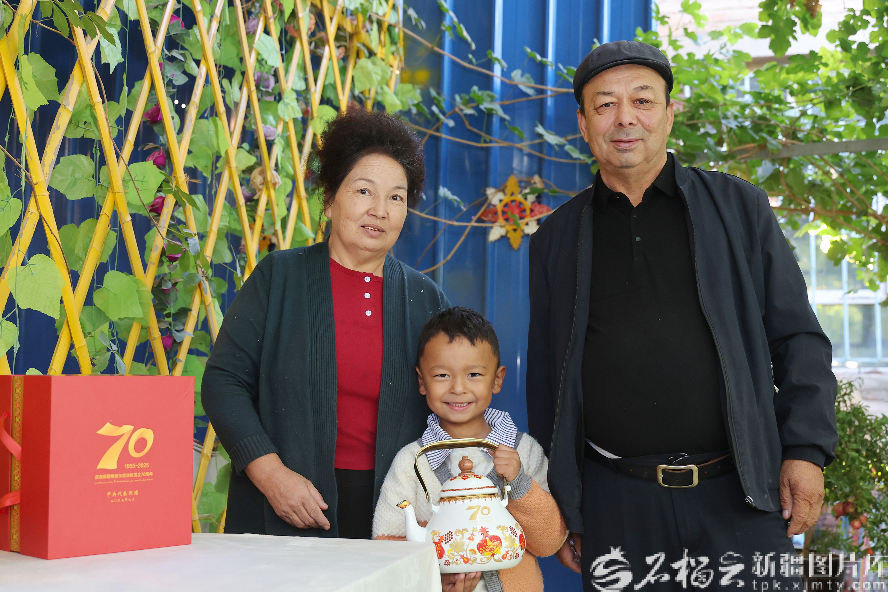 吾买尔说,在自治区成立70周年的喜庆日子里,中央代表团不远万里看望基层群众,党中央的关怀,我们铭记在心。说着,他叫来老伴和孙子,在纪念品旁留下一张合影。画面里,小孙子抱着茶壶,笑得格外灿烂。