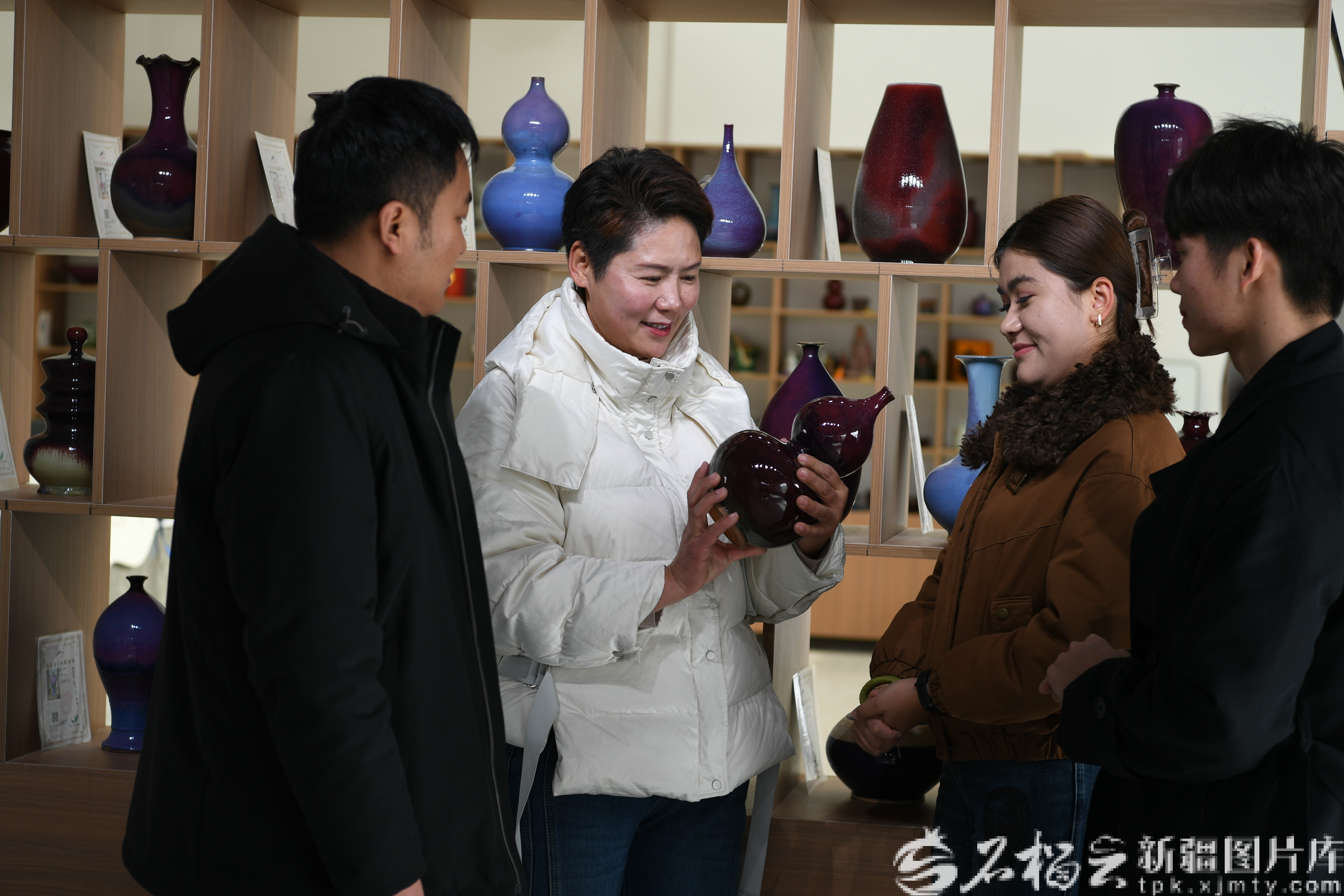 新疆昆仑玉瓷科技文化有限公司董事长连文娟(左二)正在为顾客讲“昆仑玉瓷”的烧制过程。天山网-新疆日报记者 拍热扎提·阿不都摄