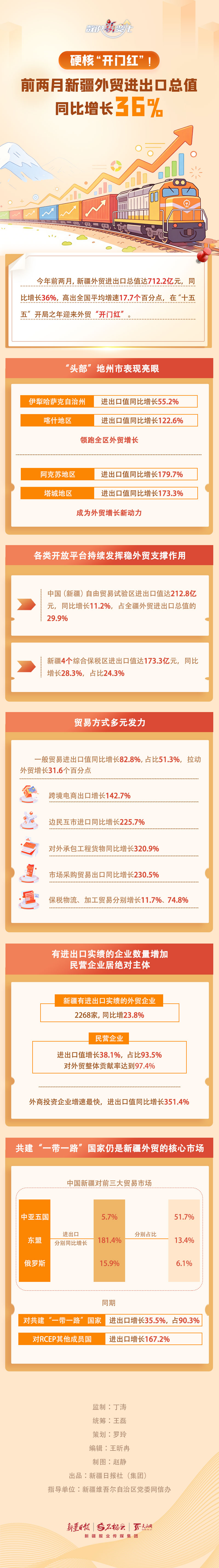 今年前两月,新疆外贸进出口总值达712.2亿元,同比增长36%,高出全国平均增速17.7个百分点,在“十五五”开局之年迎来外贸“开门红”。新疆外贸靠什么跑出“加速度”?哪些地区稳居C位?今天的《数说“新”变化》带你一同关注。